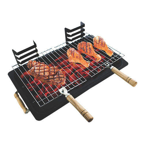 * Two adjustable grill racks with wooden handles * Racks can be placed at three different heights above coals * Wooden carrying handles and legs keep hands safe from burns * Small, portable design ideal for apartments or picnics * Vented bottom * Dimensions: 17.3”x7.3”x11 Options