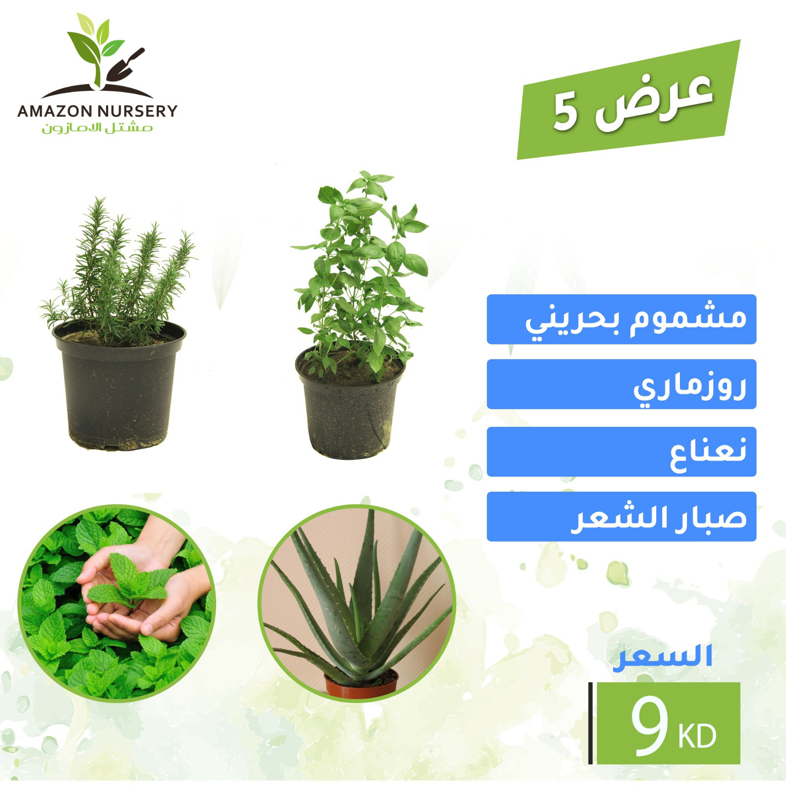 1 مشموم بحريني 1 روزماري 1 نعناع 1 صبار شعر