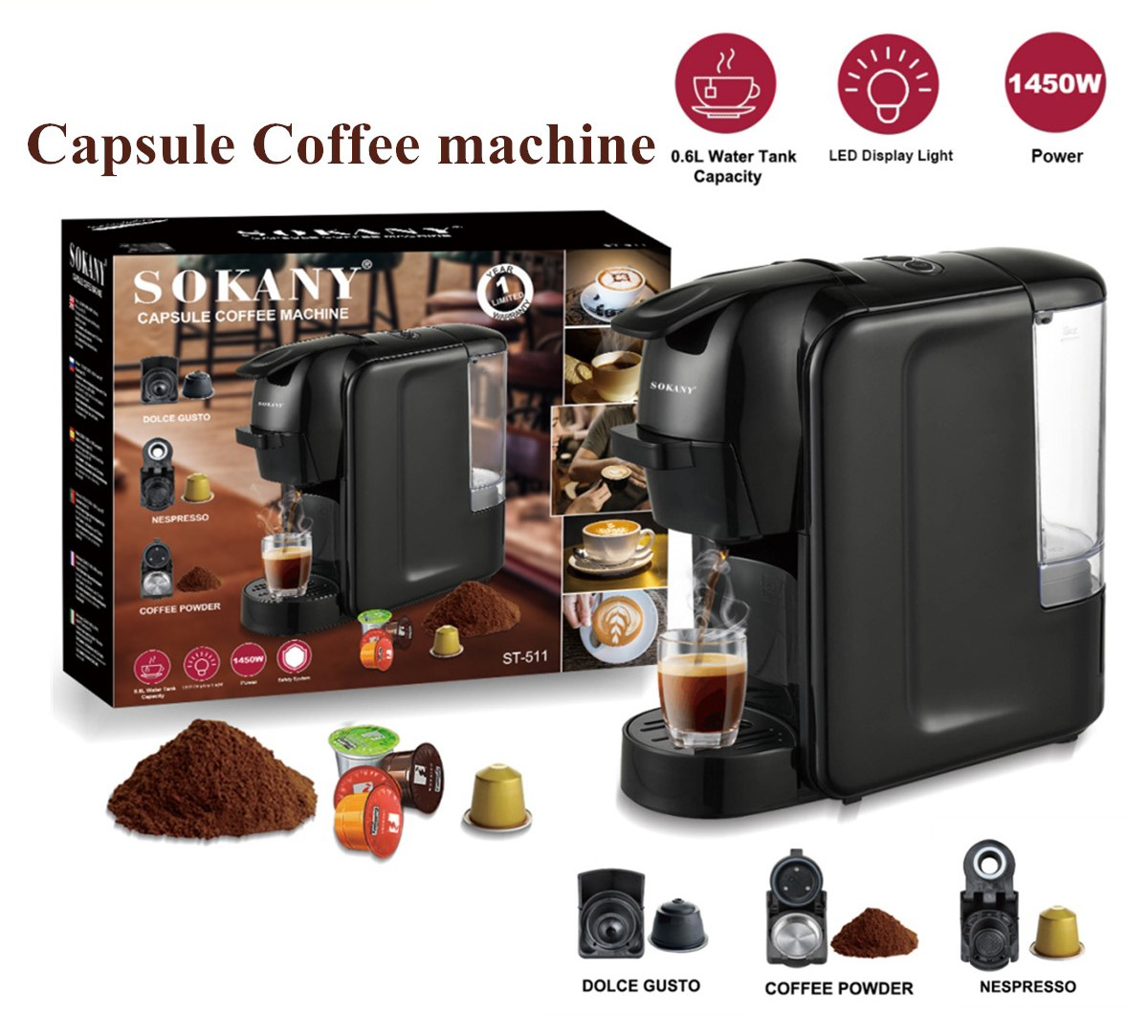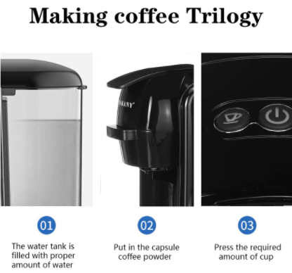 ثلاثة في واحد يمكن تحضير كوب صغير (حوالي 25 ثانية ، 30-50 مللي) ، مفتاح استخراج واحد ، إعداد كوب كبير (حوالي 47 ثانية ، 80-120 مللي) ثلاثة أنظمة قهوة نظام متعدد الأغراض ، ثلاثة في واحد ، أكثر توافقًا مع كبسولات الحليب / حليب الصويا / شاي الحليب / الشاي استخراج رابطة واحدة وظيفة بسيطة وواضحة ، لضمان ذوبان القهوة 19 بار استخراج البنزين عالي الضغط الافراج الفوري عن جوهر القهوة نظام تحضير الكوب دقيقة واحدة من الاستخراج الكامل ، 20 ثانية من التسخين المسبق للاستخراج لمدة 40 ثانية ، استمتع بلذة دون انتظار • الحرق الذكي ضد الجفاف إيقاف تشغيل تلقائي لمدة 15 دقيقة ، حروق ذكي مضاد للجفاف ، آمن وخالٍ من القلق 600 مل كبير قابل للإزالة ، سهل التنظيف ، سعة كبيرة لتلبية أكواب متعددة درجة الطعام صينية تجميع قابلة للفصل سهل الفك ووضع أكواب مختلفة تحديد: القوة ١٤٥٠ واط الموديل: ST-511 الجهد: 220-240 فولت ، 50/60 هرتز ضغط المضخة: ماكس. 19 بار السعة: 0.6 لتر / 20.3 أونصة حجم المنتج (L * H): حوالي 28 سم * 25 سم / 11 بوصة * 9.8 بوصة