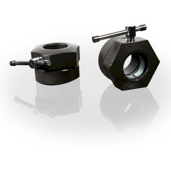ياقة من الحديد الزهر - يزن كل منها 2.5 كجم ، "تغلق" الألواح بإحكام وتأمين ضد الحديد. مصممة للقضبان الأولمبية القياسية 50 مم. تباع في أزواج.