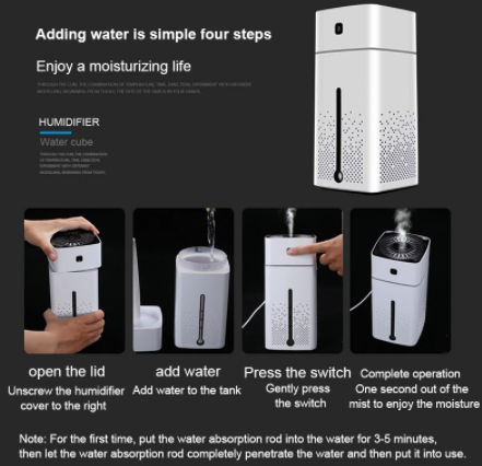 Capacity: 1000ml Power type: DC power supply Moisturizing quantity: 50ml/hour Application area: 30-40㎡ Noise level: 20dB-40dB Product size: 103mm*103mm*218mm Voltage: DC5V Applicable power: 3W
