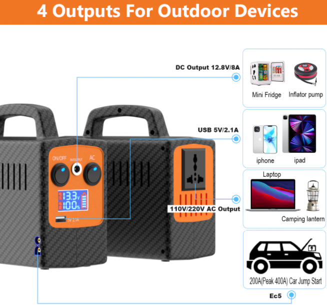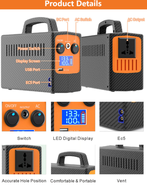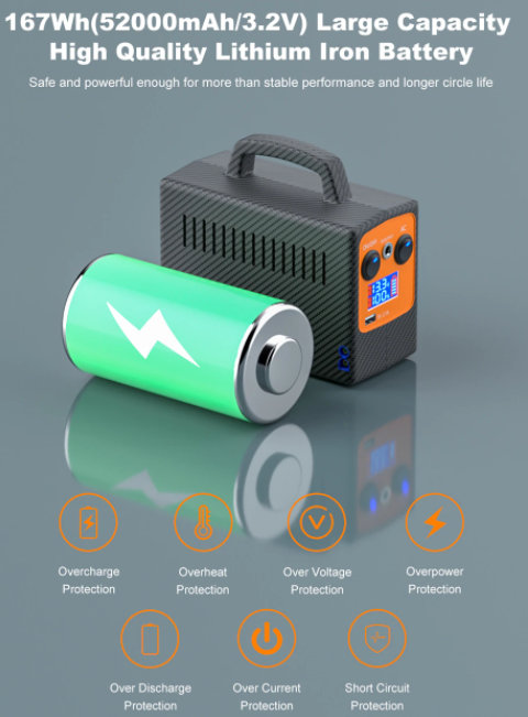 wattage : 300Wd voltage : 12V Capacity: 167Wh/52000mAh Fully Charge Time: 5-6hours DC Output: 12.8V/8A AC Max Output: 300W Peak AC output: 1xAC Pure Sine Wave Output
