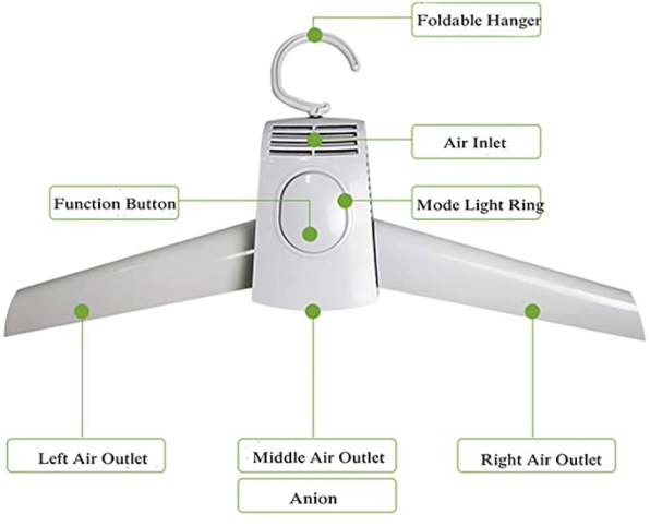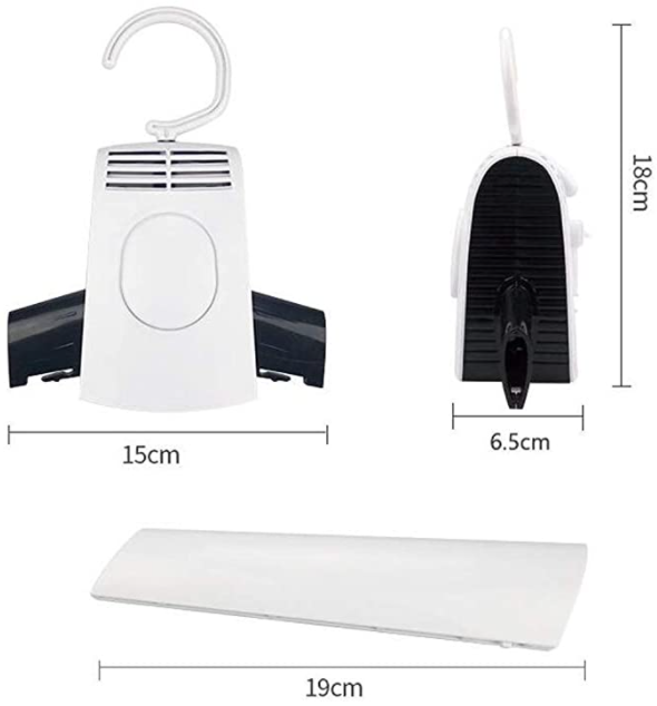 Size: 9.4 x 8.3 x 3.1 in. Power: 150 W. Integrated microphone that controls hot and cold air and switches automatically every 3 hours. It blows hot air, but not hot enough to damage clothes. Cold air option available if you are concerned about shrinkage or heat damage. Ideal for drying clothes when the space is a garment For dry clothes: T-shirt, pants, vest, light coat, baby clothes, underwear, socks and other light clothes. It is essential for home with normal clothes, small clothes and shoes with urgent drying function.